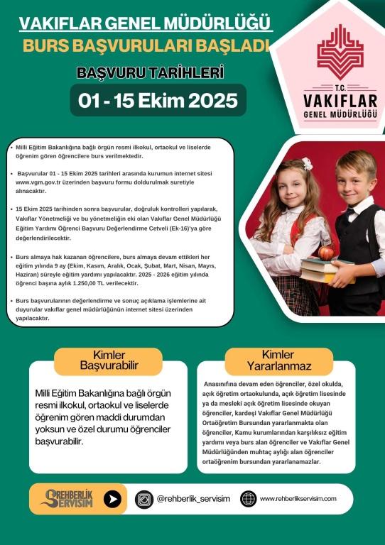 2025 - 2026 eğitim dönemi Vakıflar Genel Müdürlüğü Ortaöğrenim Bursu için başvurular 01 - 15 Ekim 2025 tarihleri arasında kurumumuz internet sitesi www.vgm.gov.tr üzerinden